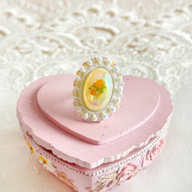✨Purple Cream Jewelry オリジナルデザインアクセ✨ フリルのような縁取りの楕円形リング♡ イエローカラーのバラがプリントされた上にグリッターがキラキラと輝くアイテム✨ 当店オリジナルリングギフトボックスにお入れしてお届け致します♪ ※表面コーティングの際に細かい気泡が入っている場合がございます。 ※こちらの商品は梱包が厚さ3cmを超えますのでゆうパックでのお届けとなります。 色:ゴールド サイズ:フリーサイズ 素材:樹脂、亜鉛合金 原産国:日本 ❤️GIFT WRAPPING❤️ ❤︎GIFT BOX❤︎ Purple Creamオリジナルギフトボックス https://purplecream.theshop.jp/items/34550130 ※ご購入毎に必ずお読み下さい↓ https://purplecream.theshop.jp/about