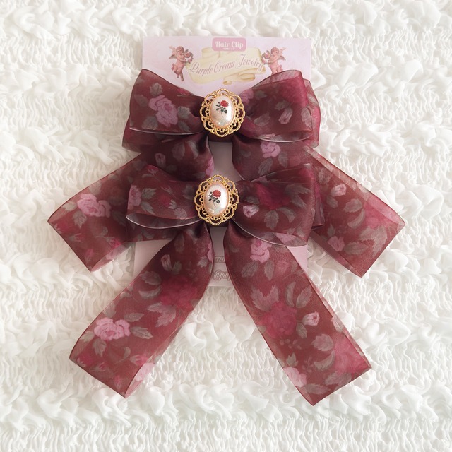 ✨Purple Cream Jewelry オリジナルデザインアクセ✨ ブラウンレッドのローズリボンヘアクリップセット♡ 左右につけられます♪ ローズ柄オーガンジーリボンを使用しております 中央にはローズプリントパーツがついています。 ※ひとつひとつ手作りで製作しておりますので大きさ等商品により多少異なります。 ※パーツは引っ張ったり、強い衝撃等を与えたりしない様ご注意ください。破損の原因となります。 ※こちらの商品は梱包が厚さ3cmを超えますのでゆうパックでのお届けとなります。 サイズ:約14cm×11.5cm 素材:ポリエステル、綿、亜鉛合金 原産国:日本 ※ご購入毎に必ずお読み下さい↓ https://purplecream.theshop.jp/about