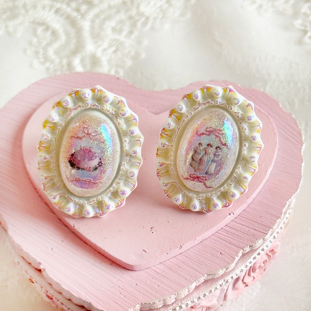 ✨Purple Cream Jewelry オリジナルデザインアクセサリー✨ 【金属アレルギー対応】 フリルのような縁取りの楕円形ピアス・イヤリング♪ 当店看板の天使ちゃんがプリントされグリッターが散りばめられています♡ イヤリング(clip-on earrings)は蝶バネ式です。 色:ゴールド サイズ:約3cm×2.5cm ピアス金具の材質:サージカルステンレス316(SUS) ニッケルフリーメッキ処理 イヤリング材質:真鍮 ※ニッケルフリーメッキ処理 その他素材:樹脂、亜鉛合金 原産国:日本 ※アレルギーが出にくいニッケルフリーメッキ処理がされたピアス・イヤリングの金具を使用しておりますが、痒み・発疹・かぶれ・炎症が出るなどお肌に合わない場合はご使用を中止して下さい。 ❤️GIFT WRAPPING❤️ ❤︎GIFT BOX❤︎ Purple Creamオリジナルギフトボックス https://purplecream.theshop.jp/items/34550130 ※ご購入毎に必ずお読み下さい↓ https://purplecream.theshop.jp/about