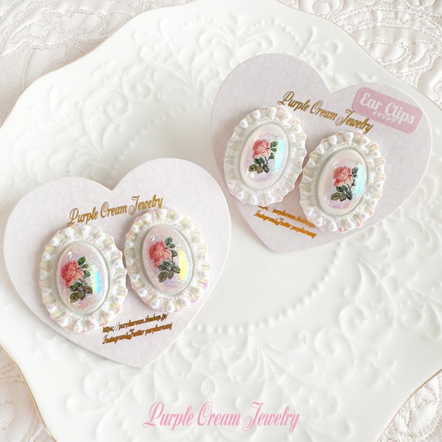 ✨Purple Cream Jewelry オリジナルデザインアクセサリー✨ 【金属アレルギー対応】 フリルのような縁取りの楕円形ピアス・イヤリング♪ バラがプリントされグリッターが散りばめられています♡ イヤリング(clip-on earrings)は蝶バネ式です。 色:ゴールド サイズ:約3cm×2.5cm ピアス金具の材質:サージカルステンレス316(SUS) ニッケルフリーメッキ処理 イヤリング材質:真鍮 ※ニッケルフリーメッキ処理 その他素材:樹脂、亜鉛合金 原産国:日本 ※アレルギーが出にくいニッケルフリーメッキ処理がされたピアス・イヤリングの金具を使用しておりますが、痒み・発疹・かぶれ・炎症が出るなどお肌に合わない場合はご使用を中止して下さい。 ❤️GIFT WRAPPING❤️ ❤︎GIFT BOX❤︎ Purple Creamオリジナルギフトボックス https://purplecream.theshop.jp/items/34550130 ※ご購入毎に必ずお読み下さい↓ https://purplecream.theshop.jp/about