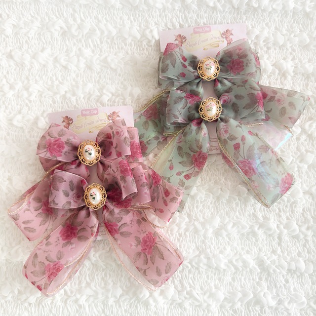 ✨Purple Cream Jewelry オリジナルデザインアクセ✨ リボンヘアクリップセット♡ 左右につけられます♪ ローズ柄オーガンジーリボンを使用しております 中央にはローズプリントパーツがついています。 ピンク・レッドの2色 ※ひとつひとつ手作りで製作しておりますので大きさ等商品により多少異なります。 ※パーツは引っ張ったり、強い衝撃等を与えたりしない様ご注意ください。破損の原因となります。 ※こちらの商品は梱包が厚さ3cmを超えますのでゆうパックでのお届けとなります。 サイズ:約5.5cm×9.5cm 素材:ポリエステル、綿、亜鉛合金 原産国:日本 ※ご購入毎に必ずお読み下さい↓ https://purplecream.theshop.jp/about