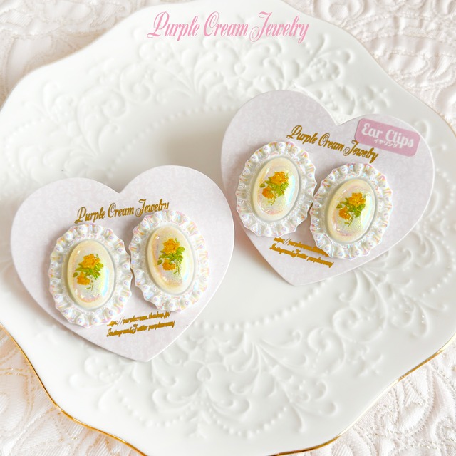 ✨Purple Cream Jewelry オリジナルデザインアクセサリー✨ 【金属アレルギー対応】 フリルのような縁取りの楕円形ピアス・イヤリング♪ イエローカラーのバラがプリントされグリッターが散りばめられています♡ イヤリング(clip-on earrings)は蝶バネ式です。 色:ゴールド サイズ:約3cm×2.5cm ピアス金具の材質:サージカルステンレス316(SUS) ニッケルフリーメッキ処理 イヤリング材質:真鍮 ※ニッケルフリーメッキ処理 その他素材:樹脂、亜鉛合金 原産国:日本 ※アレルギーが出にくいニッケルフリーメッキ処理がされたピアス・イヤリングの金具を使用しておりますが、痒み・発疹・かぶれ・炎症が出るなどお肌に合わない場合はご使用を中止して下さい。 ❤️GIFT WRAPPING❤️ ❤︎GIFT BOX❤︎ Purple Creamオリジナルギフトボックス https://purplecream.theshop.jp/items/34550130 ※ご購入毎に必ずお読み下さい↓ https://purplecream.theshop.jp/about