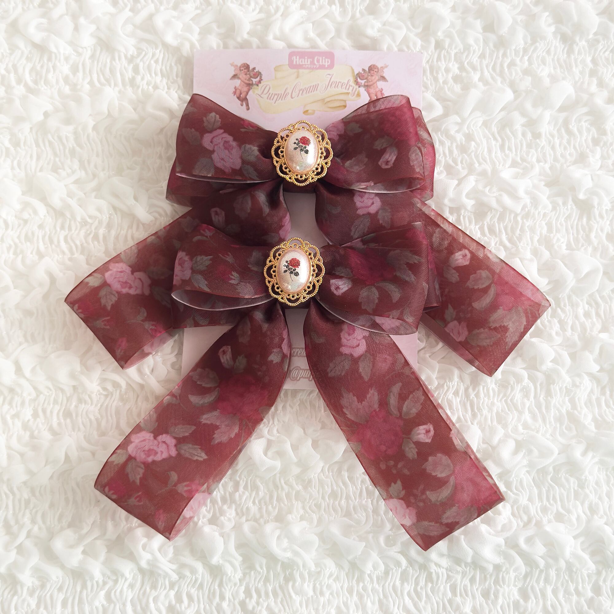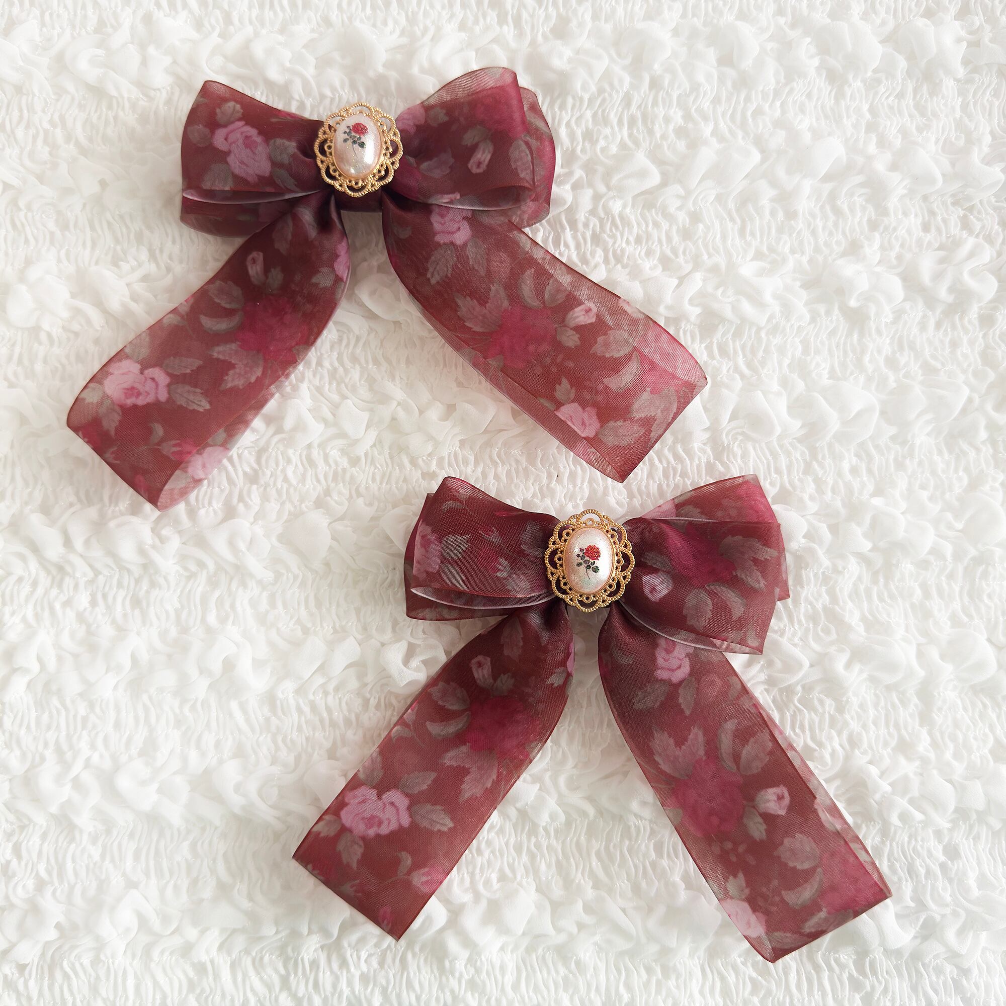 ブラウンレッドのローズリボンヘアクリップセット♡