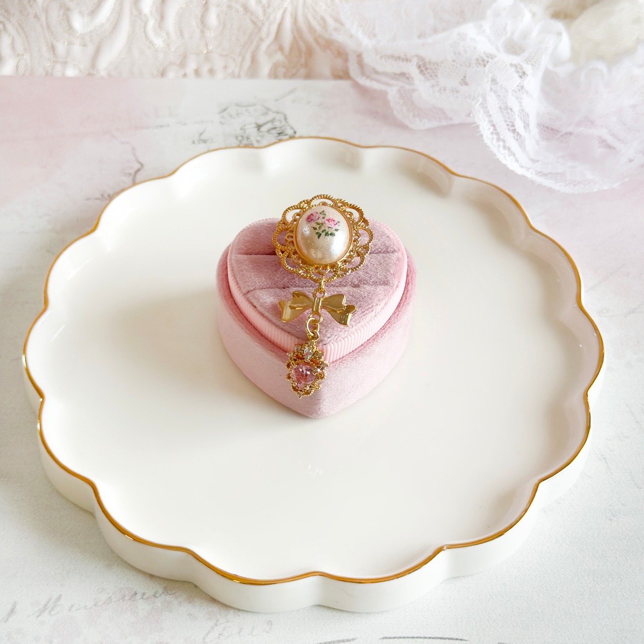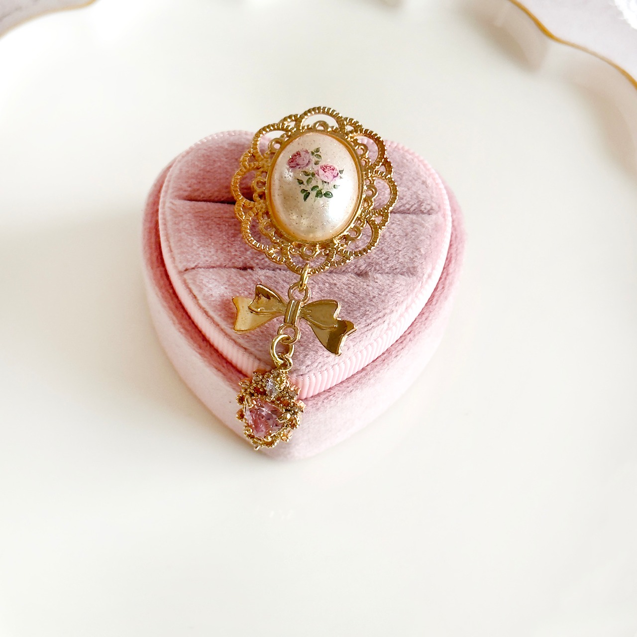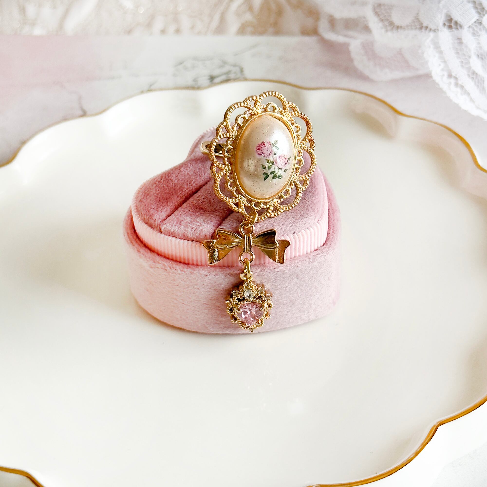 ローズモチーフにリボンとハートのチャームがついたリング♡