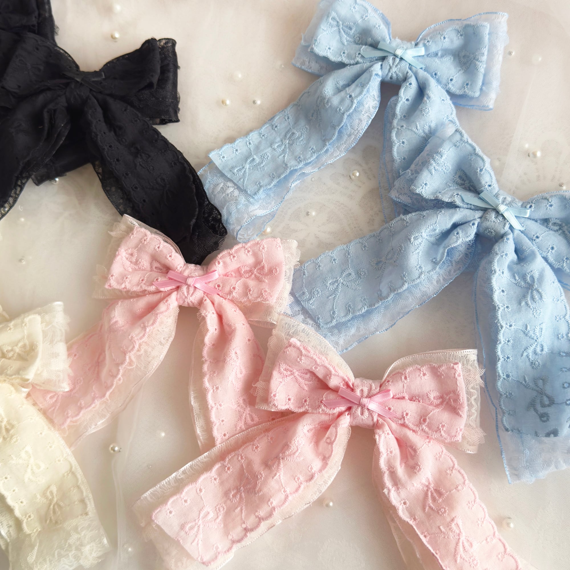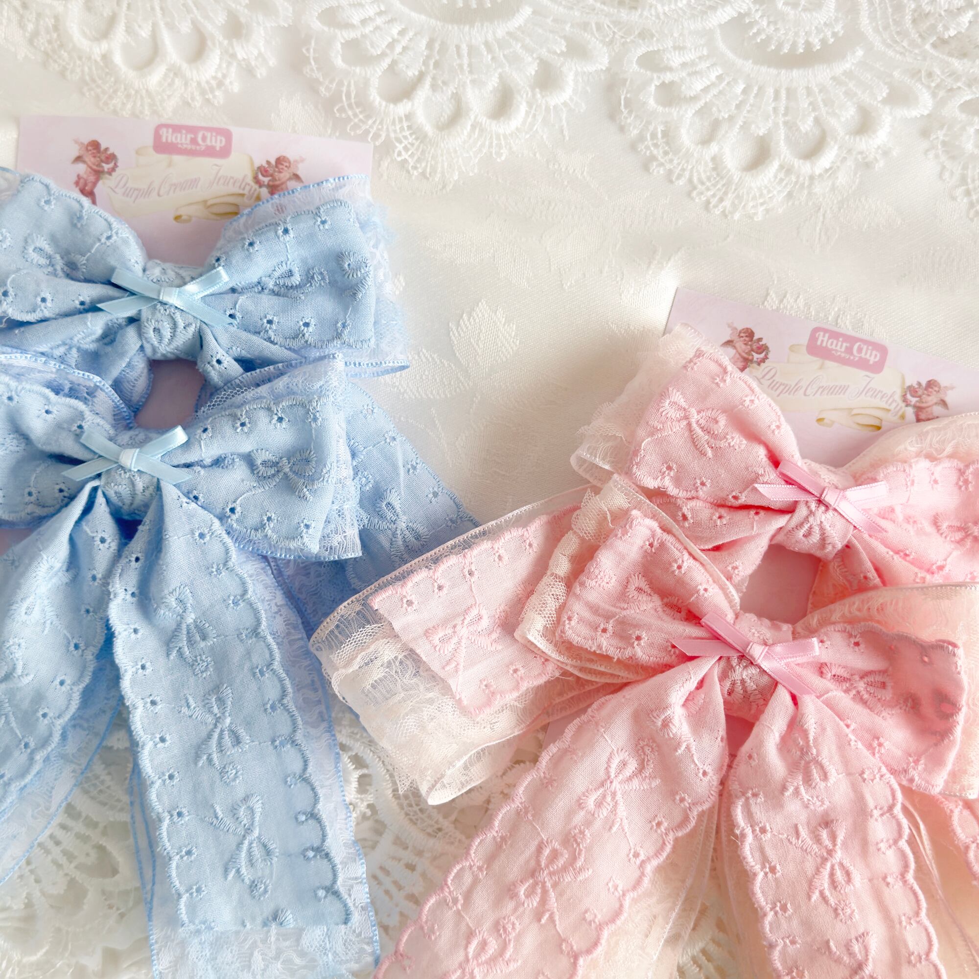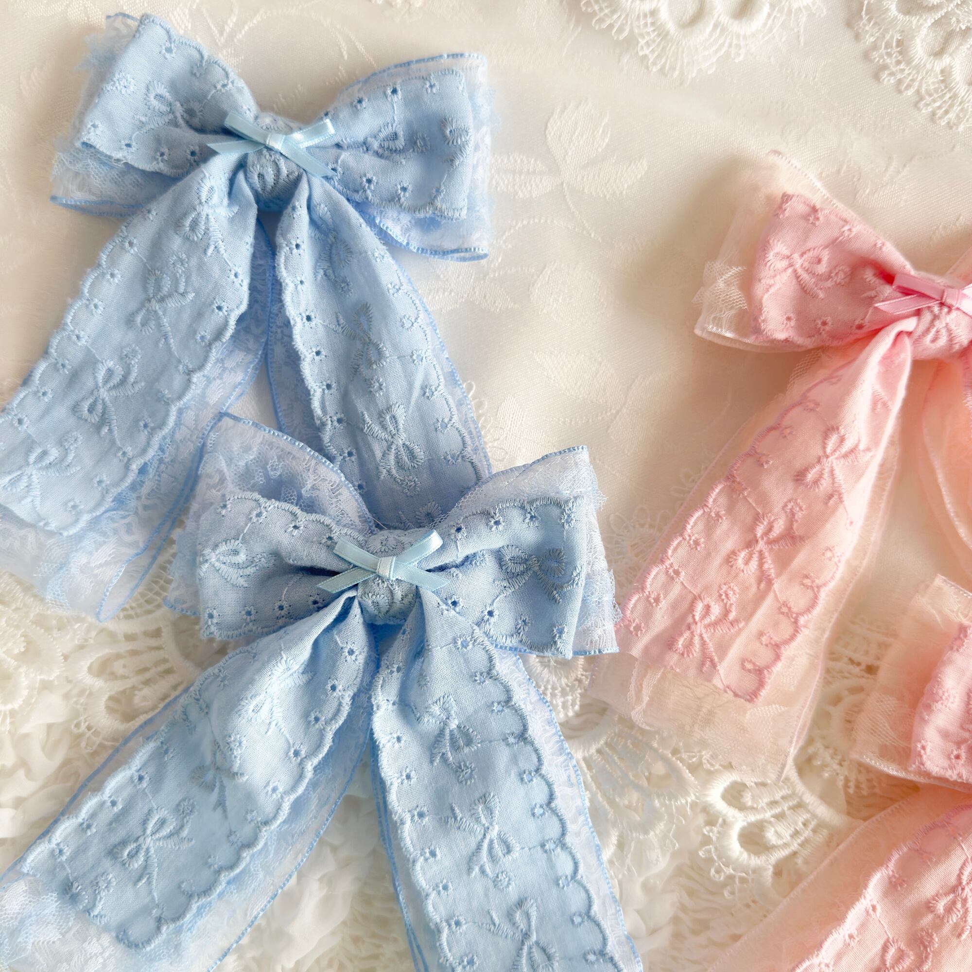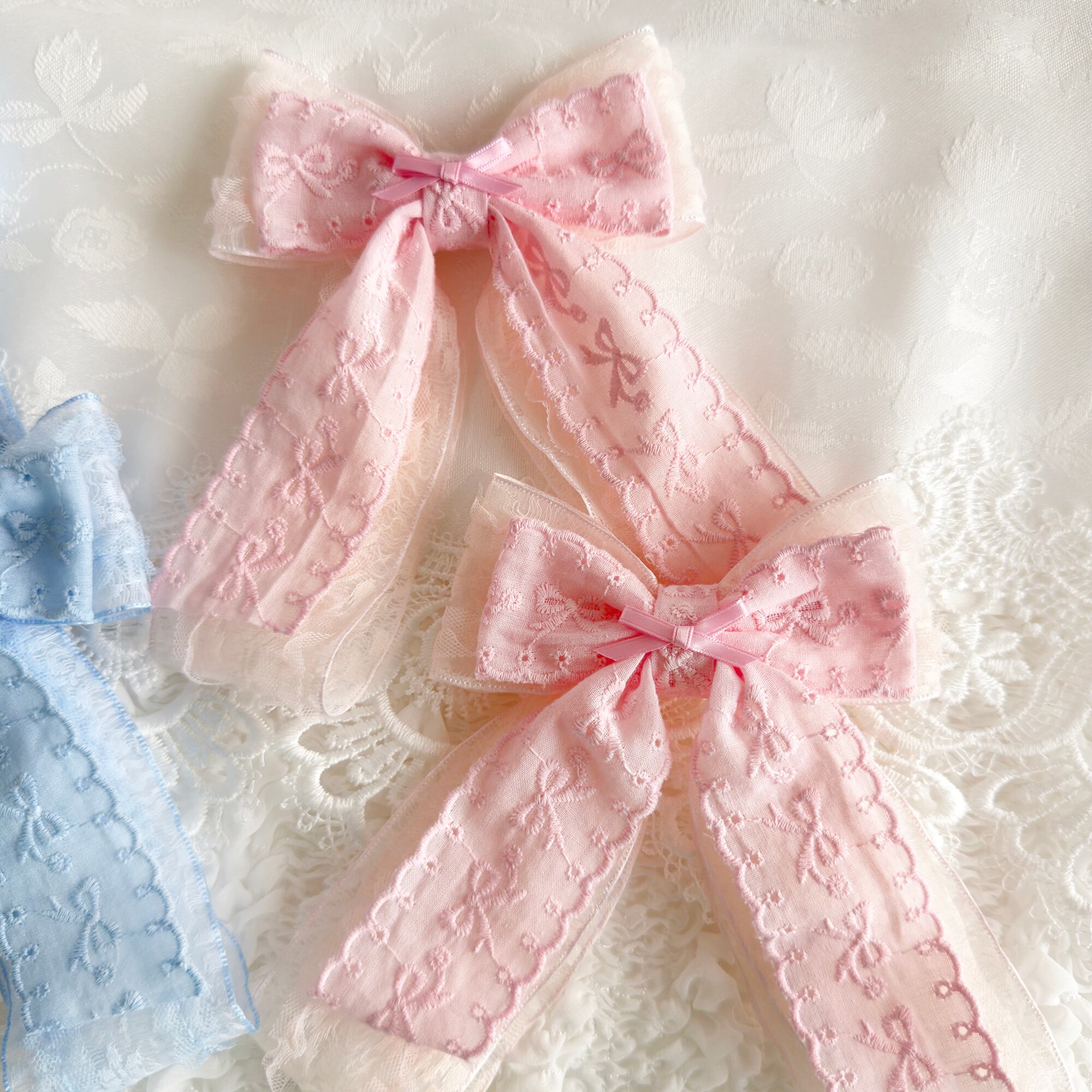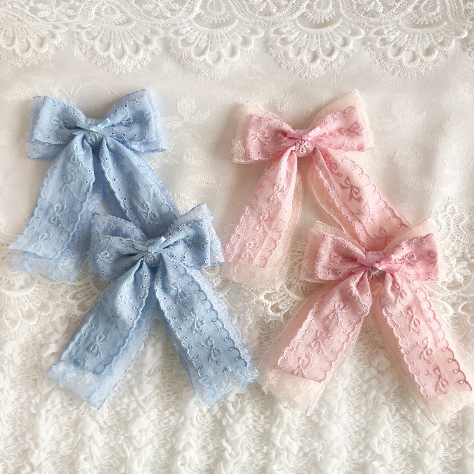 レースオーガンジーリボンにリボン刺繍のコットンリボンがダブルでボリューミーなヘアクリップセット♡