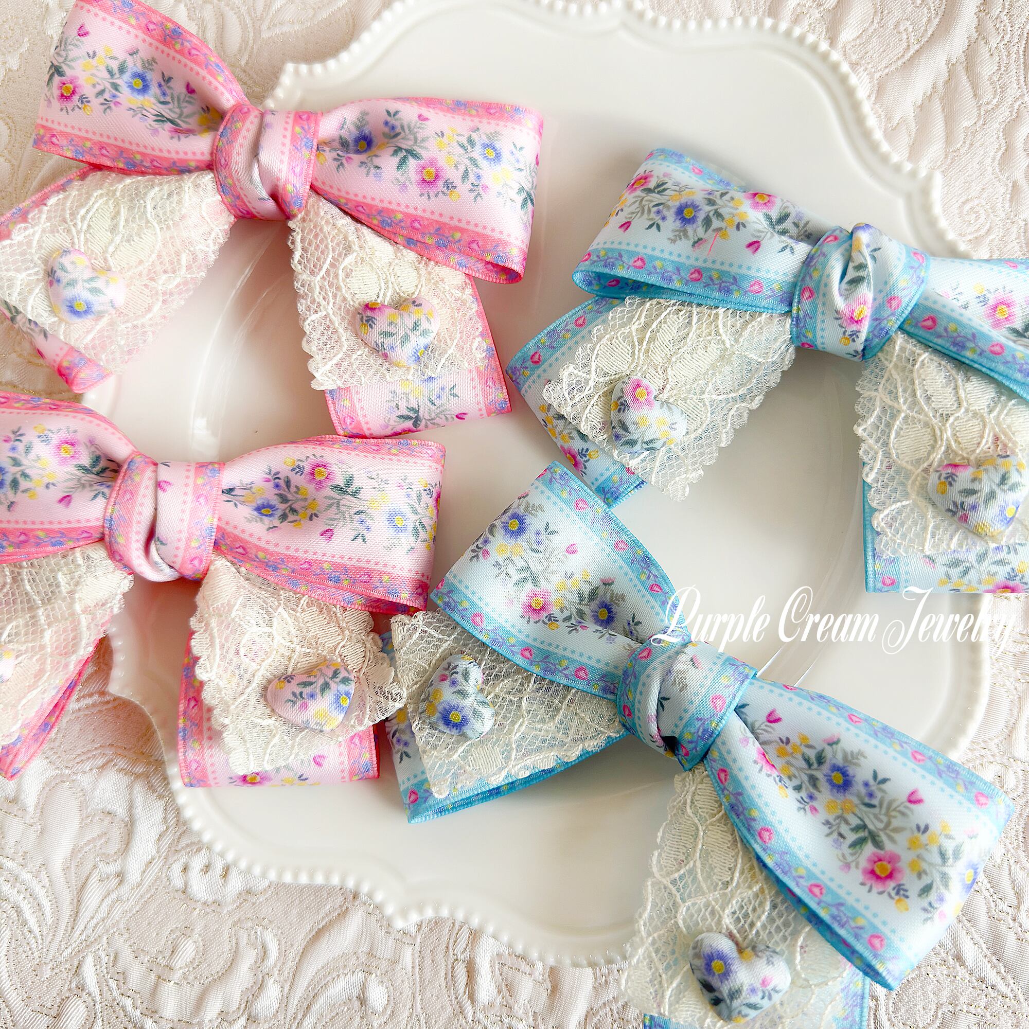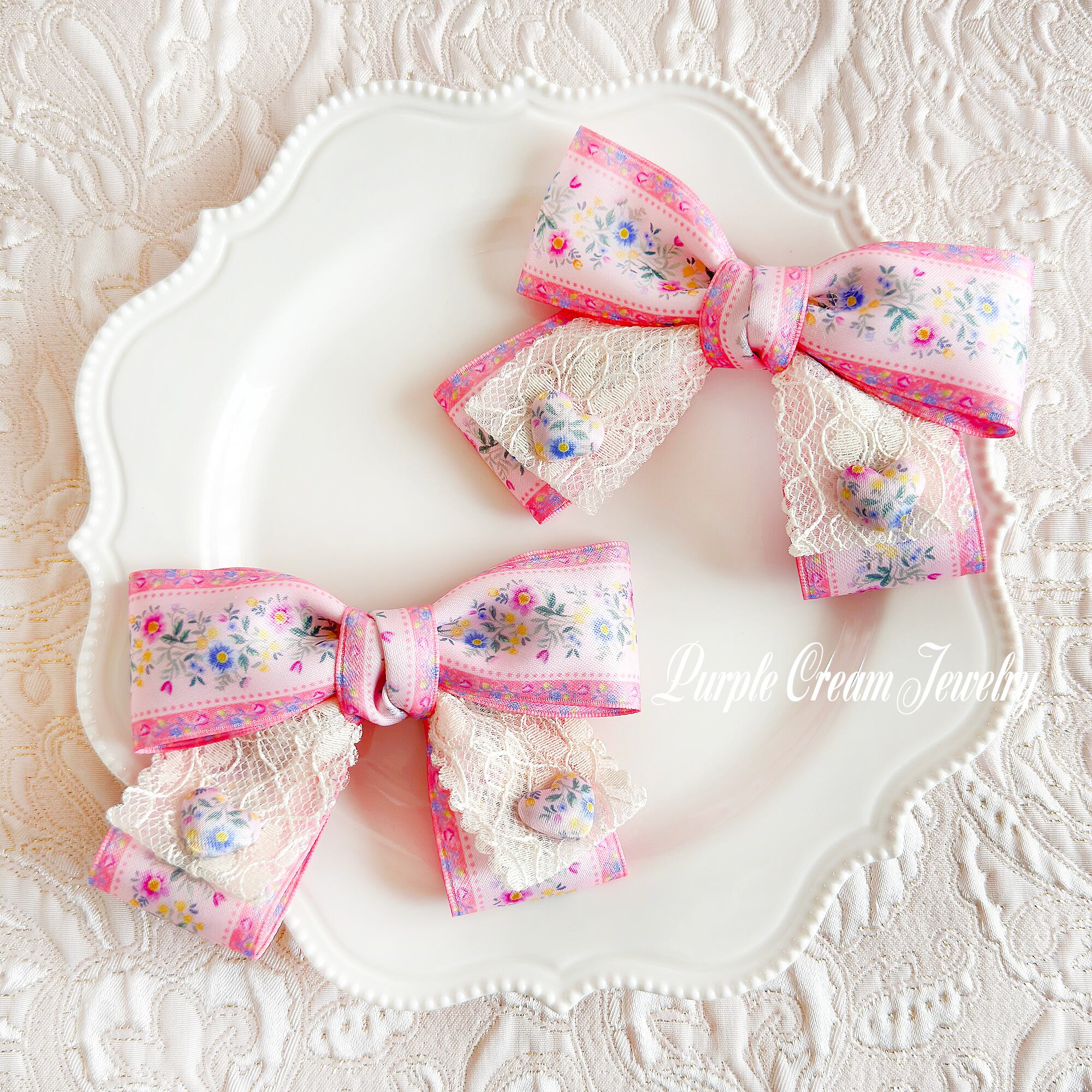 花柄のリボンとレースリボンが組み合わされたヘアクリップセット♡