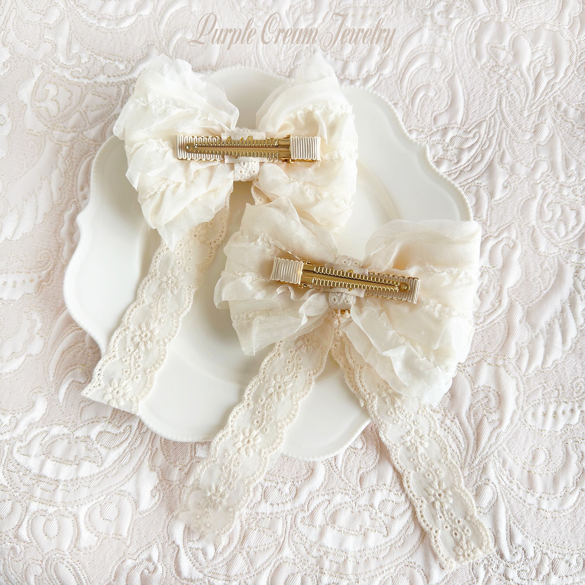 フラワーリボンとフリルボリュームリボンが組み合わされたヘアクリップセット♡