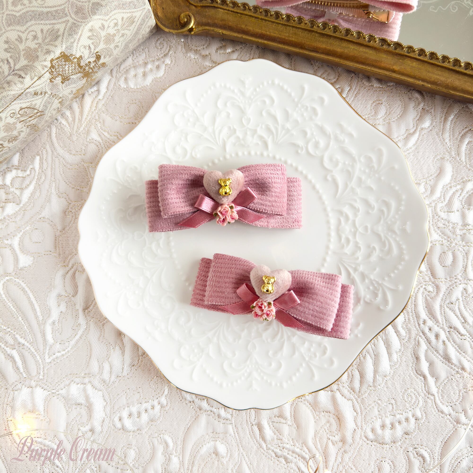 ニットリボンミニベアハートヘアクリップセット P1824