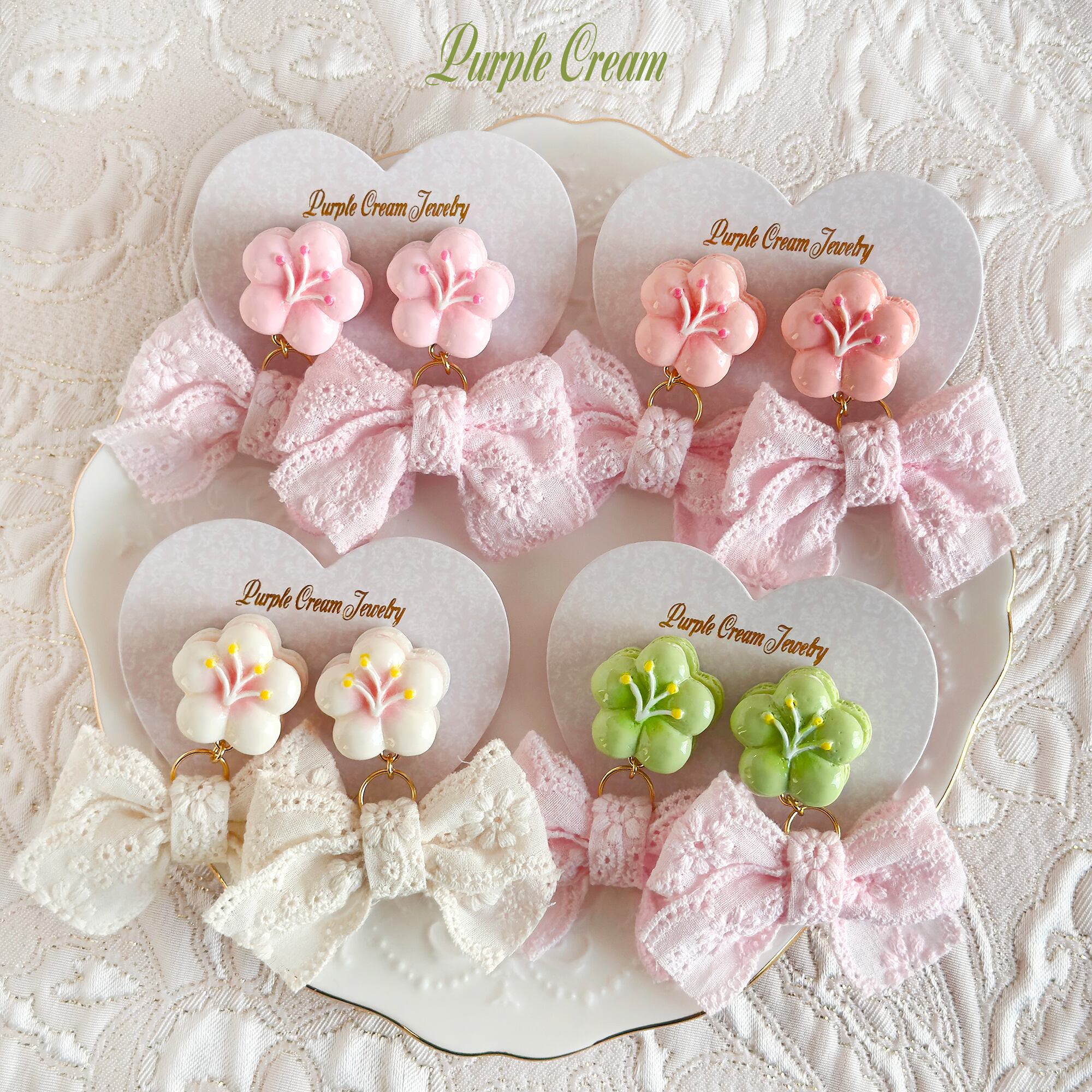 桜マカロン&コットンレースリボンピアス P1862